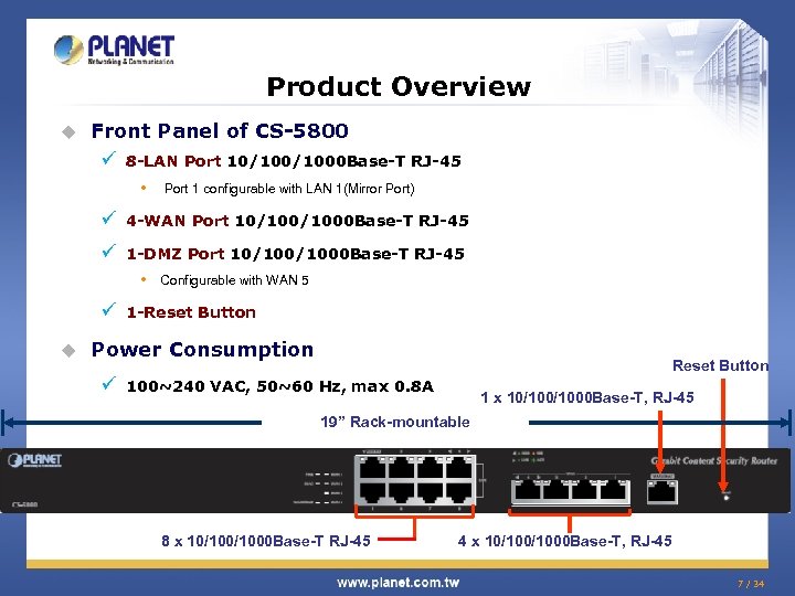 Product Overview u Front Panel of CS-5800 ü 8 -LAN Port 10/1000 Base-T RJ-45 • Port 1 configurable with LAN 1(Mirror Port) ü 4 -WAN Port 10/1000 Base-T RJ-45 ü 1 -DMZ Port 10/1000 Base-T RJ-45 • ü u Configurable with WAN 5 1 -Reset Button Power Consumption ü Reset Button 100~240 VAC, 50~60 Hz, max 0. 8 A 1 x 10/1000 Base-T, RJ-45 19” Rack-mountable 8 x 10/1000 Base-T RJ-45 4 x 10/1000 Base-T, RJ-45 7 / 34