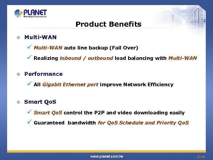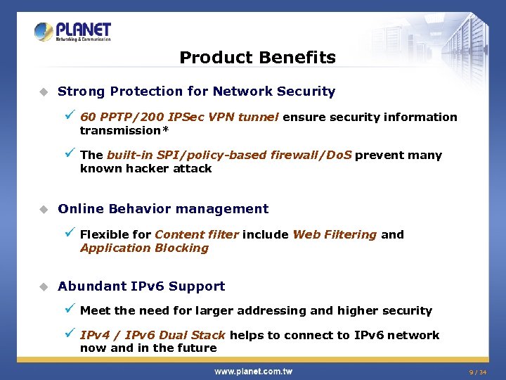 Product Benefits u Multi-WAN ü Multi-WAN auto line backup (Fail Over) ü Realizing inbound / outbound load balancing with Multi-WAN u Performance ü All Gigabit Ethernet port improve Network Efficiency u Smart Qo. S ü Smart Qo. S control the P 2 P and video downloading easily ü Guaranteed bandwidth for Qo. S Schedule and Priority Qo. S 8 / 34