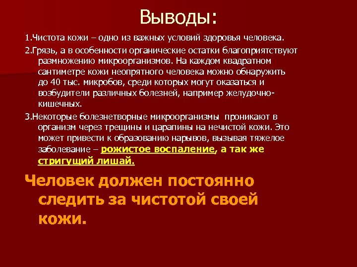 Выводы: 1. Чистота кожи – одно из важных условий здоровья человека. 2. Грязь, а в особенности органические остатки благоприятствуют размножению микроорганизмов. На каждом квадратном сантиметре кожи неопрятного человека можно обнаружить до 40 тыс. микробов, среди которых могут оказаться и возбудители различных болезней, например желудочнокишечных. 3. Некоторые болезнетворные микроорганизмы проникают в организм через трещины и царапины на нечистой кожи. Это может привести к образованию нарывов, вызывая тяжелое заболевание – рожистое воспаление, а так же стригущий лишай. Человек должен постоянно следить за чистотой своей кожи.