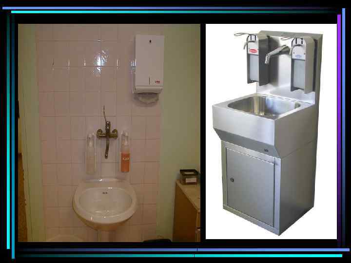 Как оборудовать место для мытья рук • Удобный подход к раковине • Проточная вода • Управление потоком воды без использования рук для операционных и РАО (обязательно). • Дозаторы для мыла, антисептика и лосьона для рук (желательно локтевые) • Диспенсер с одноразовыми полотенцами (бумажные или тканевые) • Контейнер для использованных полотенец