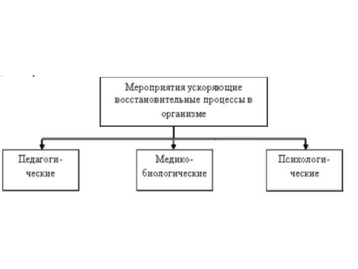 Педагогические средства восстановления • режим; • правильное сочетание периодов нагруз ки и отдыха; • рациональное планирование тренировок с учетом индивидуальных особенностей спортсмена; • правильное сочета ние общих и специальных средств тренировок; • оптимальное по строение тренировочных занятий, трениро вочных микро и макроциклов; • варьирование интервалов отдыха между тренировочными за нятиями