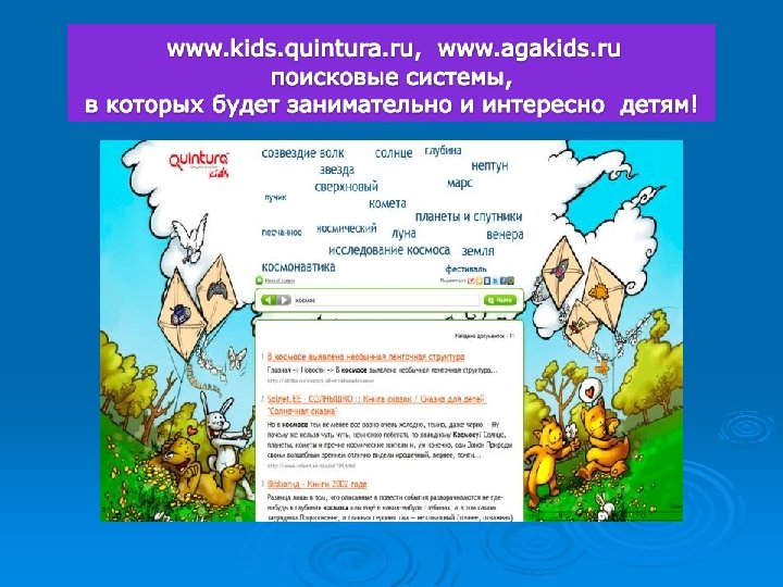 6 вопрос Какие из этих систем являются детскими поисковыми системами? А. www. yandex. ru, www. rambler. ru Б. www. kids. quintura. ru, www. agakids. ru www. google. ru, Апорт