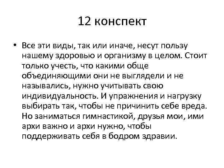 12 конспект • Все эти виды, так или иначе, несут пользу нашему здоровью и организму в целом. Стоит только учесть, что какими обще объединяющими они не выглядели и не назывались, нужно учитывать свою индивидуальность. И упражнения и нагрузку выбирать так, чтобы не причинить себе вреда. Но заниматься гимнастикой, друзья мои, ими архи важно и архи нужно, чтобы поддерживать себя в бодром здравии.