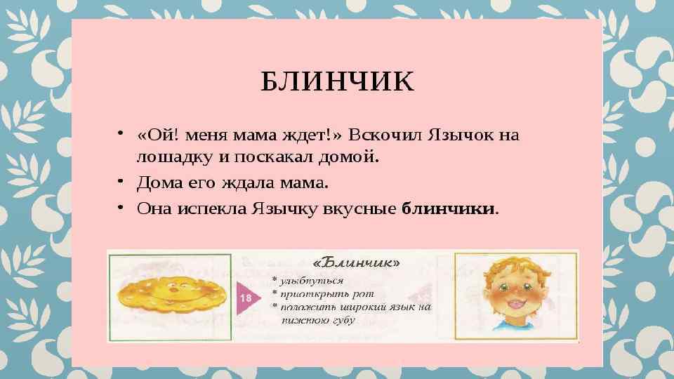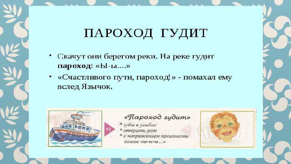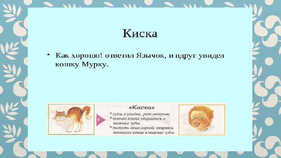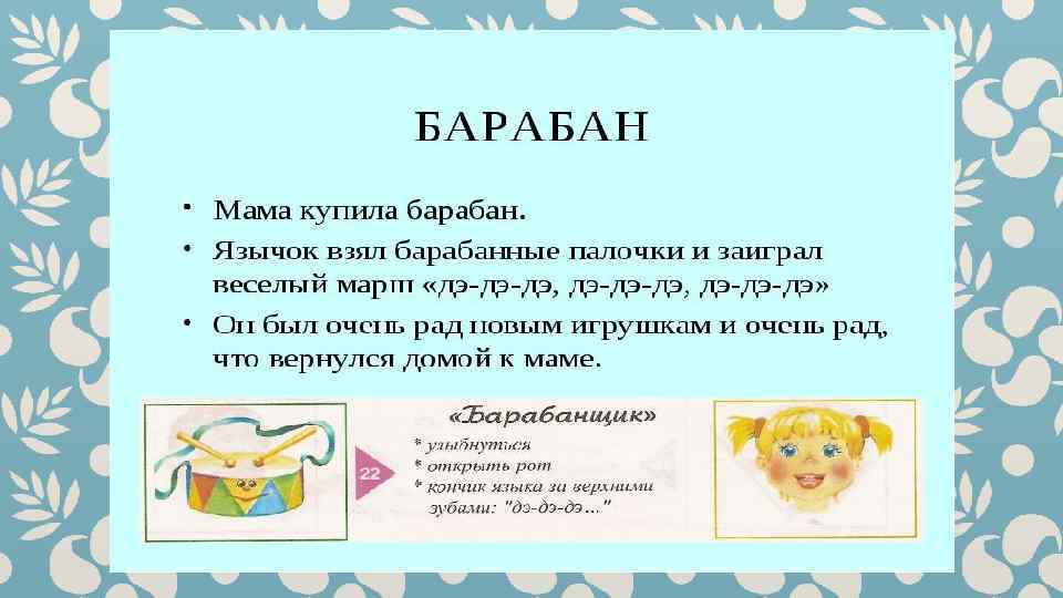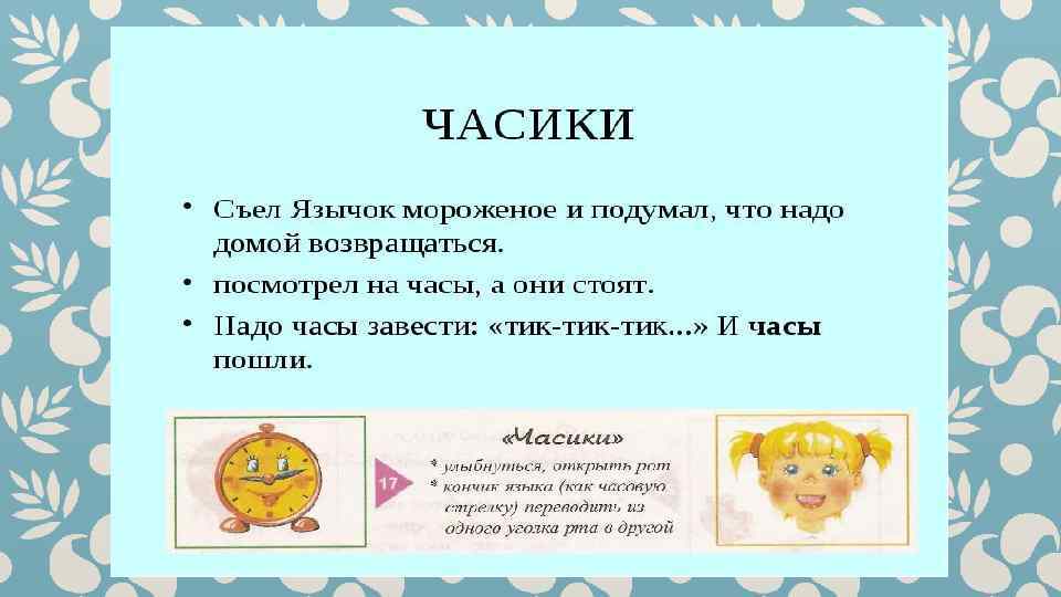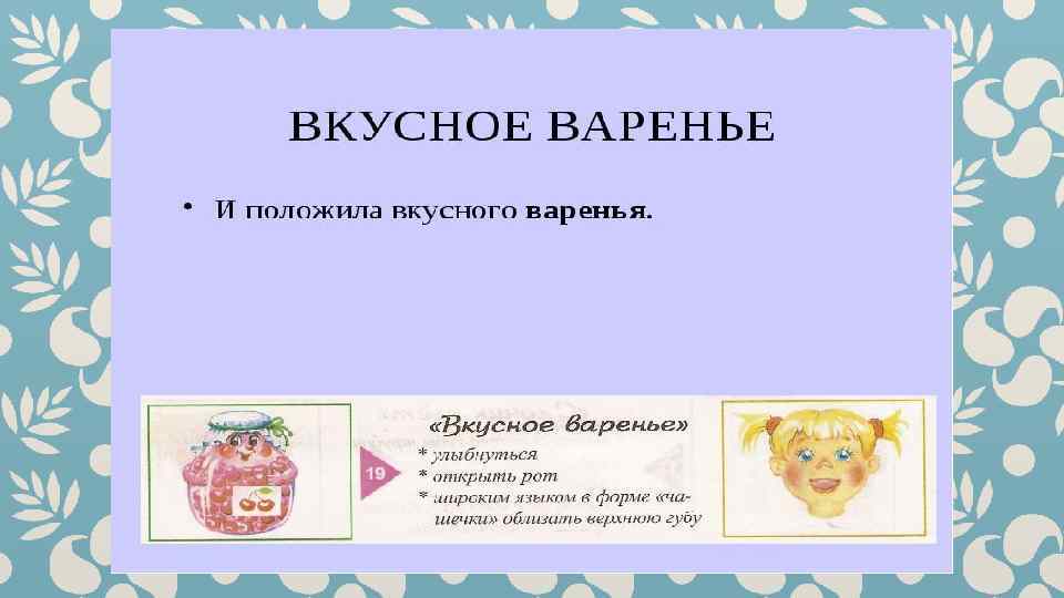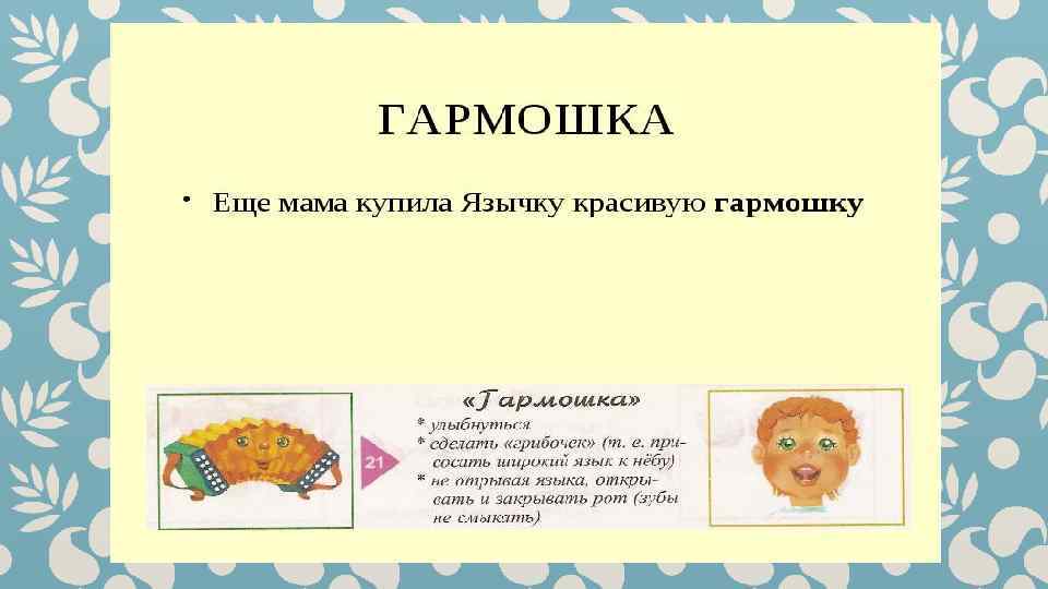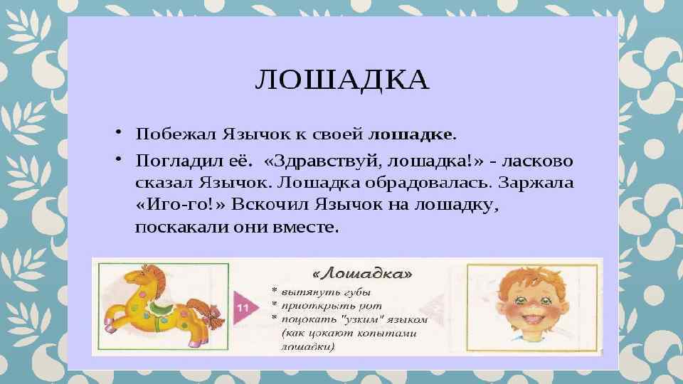 Гимнастика для рук и ног- дело привычное. Мы тренируем мышцы, чтобы они стали ловкими и сильными. А вот зачем язык тренировать? Оказывается, язык- главная мышца органов речи. Для него, как и для всякой другой мышцы, гимнастика просто необходима. Ведь язык должен быть достаточно хорошо развит, чтобы выполнять тонкие целенаправленные движения, именуемые звукопроизношением. Детям двух, трёх, четырёх лет артикуляционная гимнастика поможет быстрее «поставить» правильное звукопроизношение. Дети пяти, шести лет и старше смогут с помощью артикуляционной гимнастики во многом преодолеть уже сложившиеся нарушения звукопроизношения. Занимайтесь с ребёнком ежедневно перед зеркалом по 5 -10 минут и вскоре вы увидите, что регулярные занятия приносят свои плоды. Предлагаю вашему вниманию несколько весёлых и полезных артикуляционных упражнений, опубликованных в книге В. Н. Костыгиной «Тру-ля-ля» . Желаю увлекательного путешествия по миру артикуляционной гимнастики! Учитель-логопед МАДОУ «Детский сад № 97» г. Перми Качина С. Н.