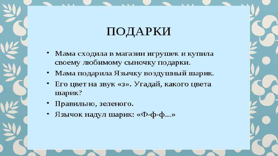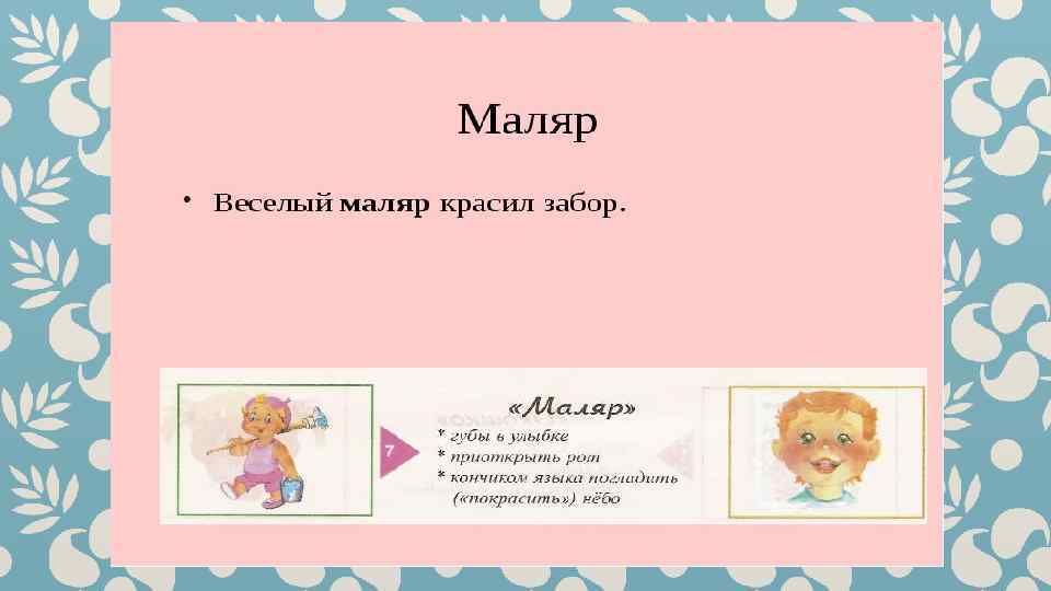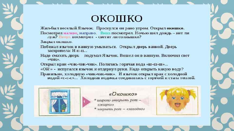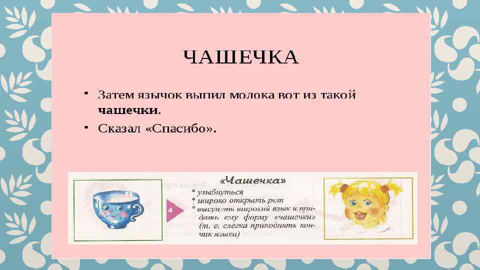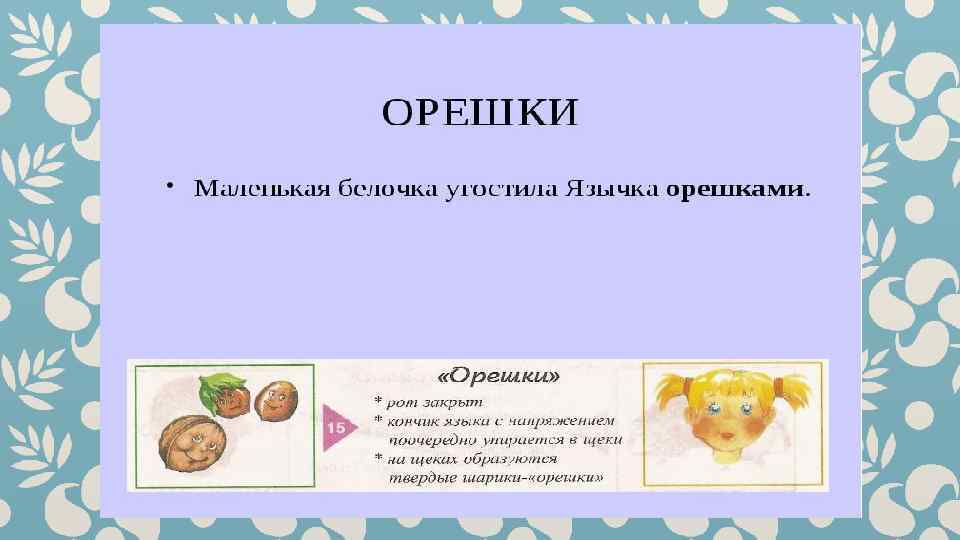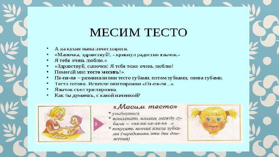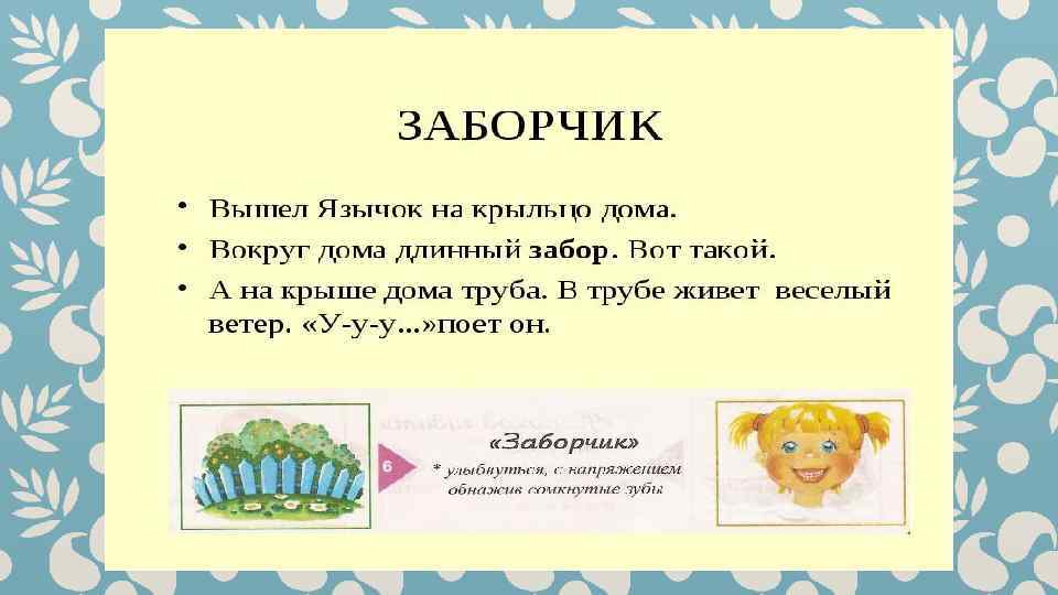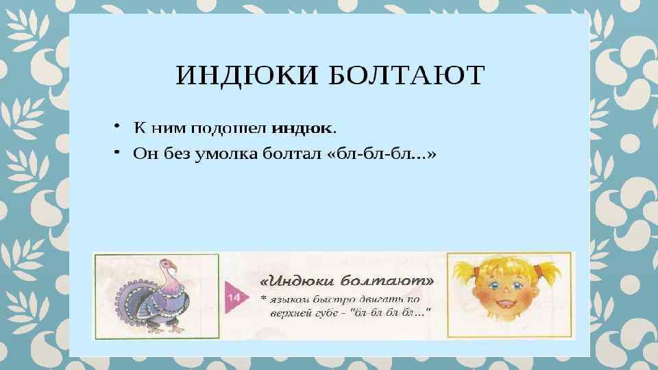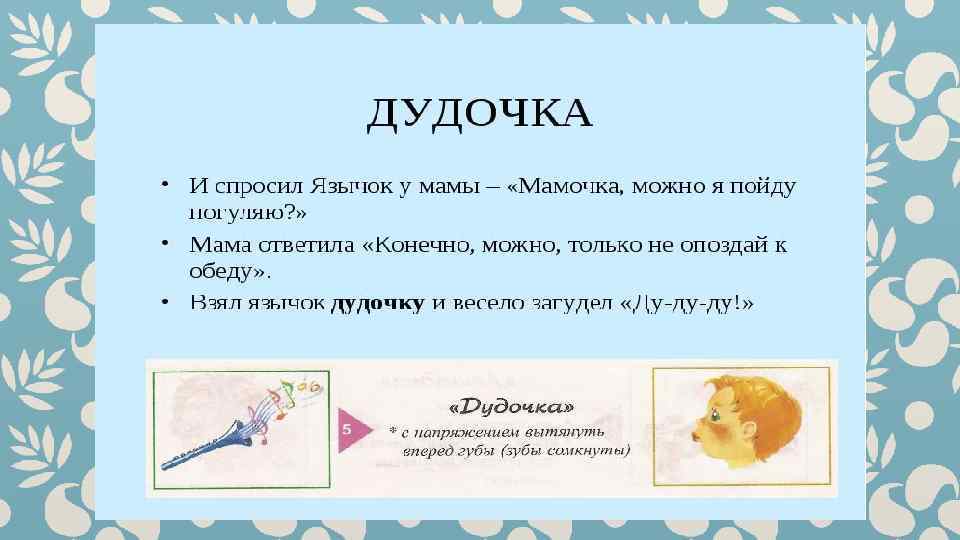 Гимнастика для рук и ног- дело привычное. Мы тренируем мышцы, чтобы они стали ловкими и сильными. А вот зачем язык тренировать? Оказывается, язык- главная мышца органов речи. Для него, как и для всякой другой мышцы, гимнастика просто необходима. Ведь язык должен быть достаточно хорошо развит, чтобы выполнять тонкие целенаправленные движения, именуемые звукопроизношением. Детям двух, трёх, четырёх лет артикуляционная гимнастика поможет быстрее «поставить» правильное звукопроизношение. Дети пяти, шести лет и старше смогут с помощью артикуляционной гимнастики во многом преодолеть уже сложившиеся нарушения звукопроизношения. Занимайтесь с ребёнком ежедневно перед зеркалом по 5 -10 минут и вскоре вы увидите, что регулярные занятия приносят свои плоды. Предлагаю вашему вниманию несколько весёлых и полезных артикуляционных упражнений, опубликованных в книге В. Н. Костыгиной «Тру-ля-ля» . Желаю увлекательного путешествия по миру артикуляционной гимнастики! Учитель-логопед МАДОУ «Детский сад № 97» г. Перми Качина С. Н.