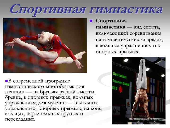 Гимнастические упражнения входили в систему физического воспитания ещё в Древней Греции, служили средством подготовки юношей к участию в Олимпийских играх. С конца XVIII — начала XIX века в западноевропейских и русской системах физического воспитания использовались упражнения на гимнастических снарядах, опорные прыжки. Во 2 -й половине XIX века в ряде стран Западной Европы стали проводиться соревнования по некоторым видам гимнастических упражнений. Первые состязания в России состоялись в 1885 году в Москве. В 1881 году создана Международная федерация гимнастики. С 1896 года спортивная гимнастика включена в программу Олимпийских игр, с 1928 года в Олимпийских играх участвуют женщины. С 1903 года проводятся чемпионаты мира (до 1913 — раз в 2 года, с 1922 — раз в 4 года), с 1934 в чемпионатах участвуют женщины.