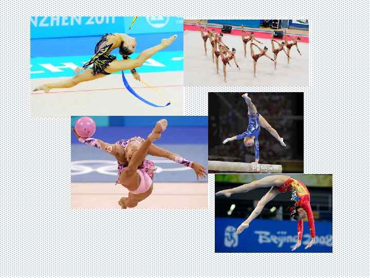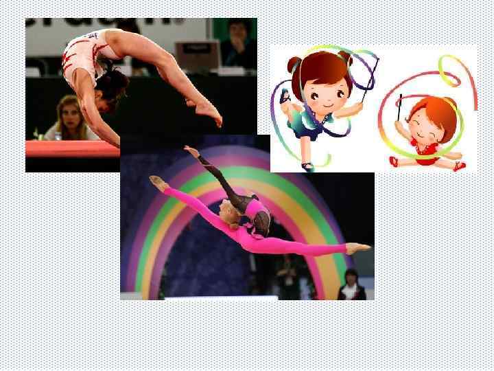 • Художественная гимнастика — вид спорта, выполнение под музыку различных гимнастических и танцевальных упражнений без предмета, а также с предметом (скакалка, обруч, мяч, булавы, лента ). • В последнее время выступления без предмета не проводятся на соревнованиях мирового класса. При групповых выступлениях используются или одновременно два вида предметов (например — обручи и мячи), или один вид (пять мячей, пять пар булав). Победители определяются в многоборье, в отдельных видах и групповых упражнениях.