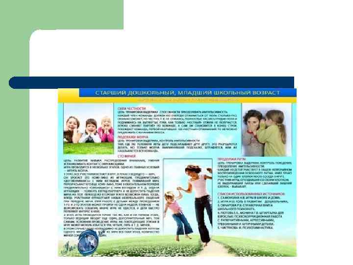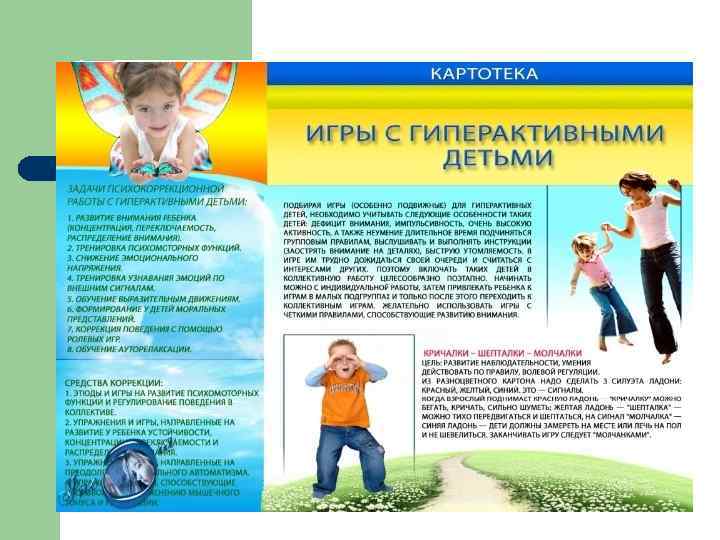 l - Друзей у Вашего ребенка должно быть мало: чем больше будет у него товарищей по играм, тем больше он будет возбуждаться с ними. l Желательно, чтобы друзьями не были гиперактивными - Игра для Вашего ребенка — важнее разных медикаментов, вернее, главное лекарственное средство. - Стараться приобщать ребенка к подвижным и спортивным играм, в которых можно разрядиться от бьющей ключом энергии. - Гиперактивного ребенка с ранних лет желательно занять каким-то видом спорта, доступным его возрасту и темпераменту. - Не путать гиперактивность с темпераментом ребенка, особенно тогда, когда в семье малыш холерик. l l