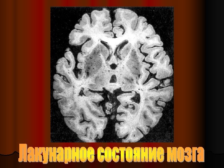Патоморфология ХГЭ l Лейкоареоз (мелкоочаговые и диффузные изменения белого вещества субкортикально) l Лакунарные инфаркты (очаги ишемии в виде полости 0, 1 -1, 5 см) l Лакунарное состояние