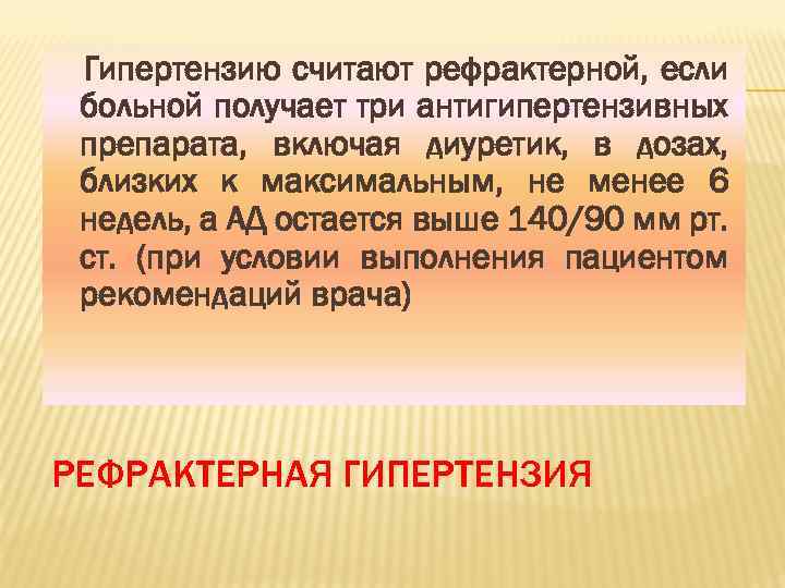 Гипертензию считают рефрактерной, если больной получает три антигипертензивных препарата, включая диуретик, в дозах, близких к максимальным, не менее 6 недель, а АД остается выше 140/90 мм рт. ст. (при условии выполнения пациентом рекомендаций врача) РЕФРАКТЕРНАЯ ГИПЕРТЕНЗИЯ