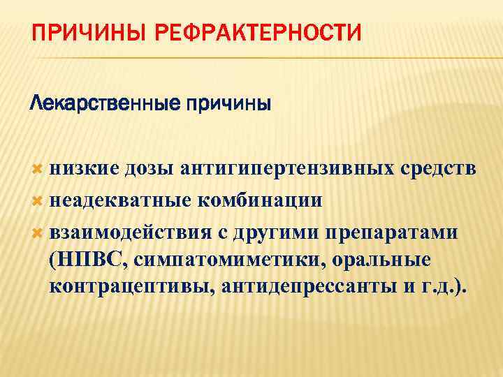 ПРИЧИНЫ РЕФРАКТЕРНОСТИ Лекарственные причины низкие дозы антигипертензивных средств неадекватные комбинации взаимодействия с другими препаратами (НПВС, симпатомиметики, оральные контрацептивы, антидепрессанты и г. д. ).