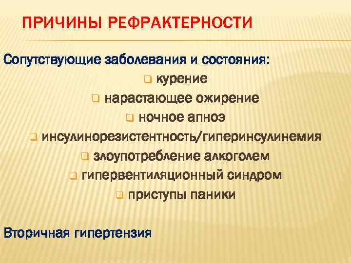 ПРИЧИНЫ РЕФРАКТЕРНОСТИ Сопутствующие заболевания и состояния: q курение q нарастающее ожирение q ночное апноэ q инсулинорезистентность/гиперинсулинемия q злоупотребление алкоголем q гипервентиляционный синдром q приступы паники Вторичная гипертензия