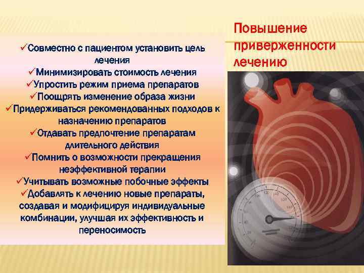 Повышение üСовместно с пациентом установить цель приверженности лечения лечению üМинимизировать стоимость лечения üУпростить режим приема препаратов üПоощрять изменение образа жизни üПридерживаться рекомендованных подходов к назначению препаратов üОтдавать предпочтение препаратам длительного действия üПомнить о возможности прекращения неэффективной терапии üУчитывать возможные побочные эффекты üДобавлять к лечению новые препараты, создавая и модифицируя индивидуальные комбинации, улучшая их эффективность и переносимость