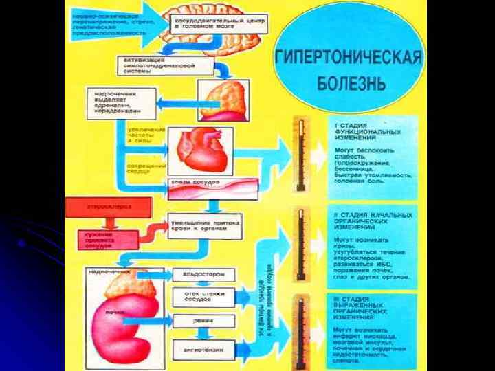 Патогенез В развитии гипертонического криза важную роль играет соотношение общего периферического сопротивления сосудов к величине сердечного выброса. В результате нарушений сосудистой регуляции происходит спазм артериол, вследствие чего происходит повышение частоты сердечных сокращений, развивается порочный круг, и происходит резкий подъем артериального давления, причем из-за спазма многие органы оказываются в состоянии гипоксии, что может привести к развитию ишемических осложнений.