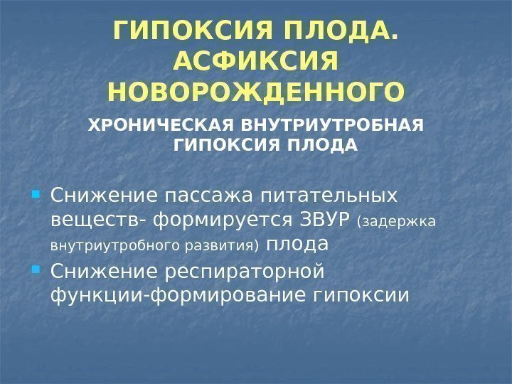 ГИПОКСИЯ ПЛОДА. АСФИКСИЯ НОВОРОЖДЕННОГО ХРОНИЧЕСКАЯ ВНУТРИУТРОБНАЯ ГИПОКСИЯ ПЛОДА Снижение пассажа питательных веществ- формируется ЗВУР (задержка внутриутробного развития) плода Снижение респираторной функции-формирование гипоксии