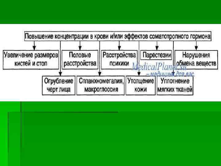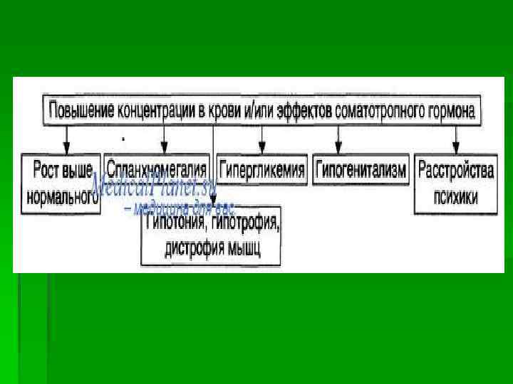 звенья патогенеза § центрогенные (результат поражений нейронов коры и/или гипоталамуса, приводящих к гиперпродукции соматолиберина и СТГ и/или снижению выработки соматостатина), § первично-железистые (гипофизарное; следствие повышенного синтеза СТГ ацидофильными клетками аденогипофиза), § постжелезистые (среди них наиболее часто встречается рецепторный, обусловленный повышенной чувствительностью тканей и органов к СТГ).