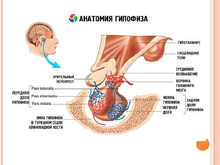 Гипофиз (hypophysis) - железа внутренней секреции, он располагается в специальном углублении основания черепа, "турецком седле" и при помощи ножки связан с основанием мозга. В гипофизе выделяют переднюю долю (аденогипофиз железистый гипофиз) и заднюю долю (нейрогипофиз). Задняя доля, или нейрогипофиз, состоит из нейроглиальных клеток и является продолжением воронки гипоталамуса. Более крупная доля - аденогипофиз, построена из железистых клеток. Благодаря тесному взаимодействию гипоталамуса с гипофизом в промежуточном мозге функционирует единая гипиталамо-гипофизарная система, управляющая работой всех эндокринных желез, а с их помощью вегетативными функциями организма.