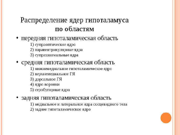 Гипоталамус – это многоядерная структура. Ядра гипоталамуса — это анатомически выделенные группы нейронов, выполняющие специализированные функции. Всего в гипоталамусе насчитывается свыше 30 ядер, большинство из которых парные.