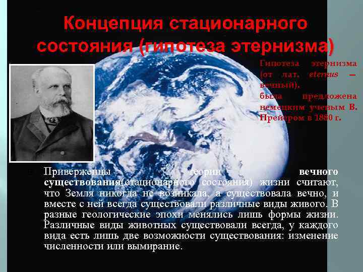 Концепция стационарного состояния (гипотеза этернизма) Гипотеза этернизма (от лат. eternus — вечный). была предложена немецким ученым В. Прейером в 1880 г. Приверженцы теории вечного существования(стационарного состояния) жизни считают, что Земля никогда не возникала, а существовала вечно, и вместе с ней всегда существовали различные виды живого. В разные геологические эпохи менялись лишь формы жизни. Различные виды животных существовали всегда, у каждого вида есть лишь две возможности существования: изменение численности или вымирание.