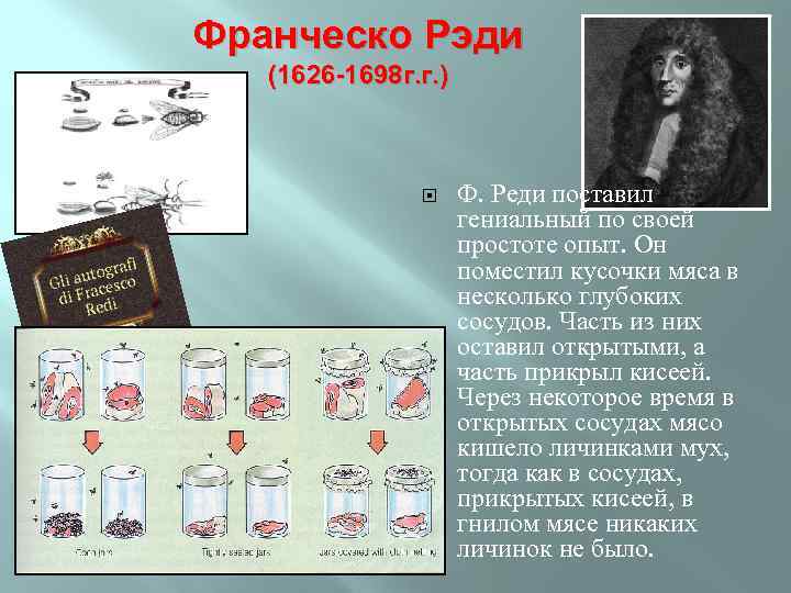 Франческо Рэди (1626 -1698 г. г. ) Жизнь может возникнуть только из предшествующей жизни. Ф. Реди поставил гениальный по своей простоте опыт. Он поместил кусочки мяса в несколько глубоких сосудов. Часть из них оставил открытыми, а часть прикрыл кисеей. Через некоторое время в открытых сосудах мясо кишело личинками мух, тогда как в сосудах, прикрытых кисеей, в гнилом мясе никаких личинок не было.