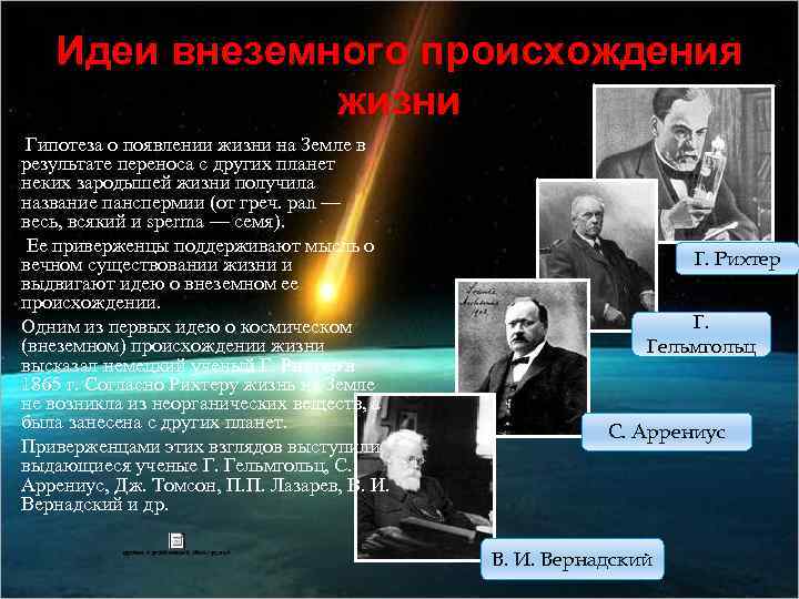 Идеи внеземного происхождения жизни Гипотеза о появлении жизни на Земле в результате переноса с других планет неких зародышей жизни получила название панспермии (от греч. pan — весь, всякий и sperma — семя). Ее приверженцы поддерживают мысль о вечном существовании жизни и выдвигают идею о внеземном ее происхождении. Одним из первых идею о космическом (внеземном) происхождении жизни высказал немецкий ученый Г. Рихтер в 1865 г. Согласно Рихтеру жизнь на Земле не возникла из неорганических веществ, а была занесена с других планет. Приверженцами этих взглядов выступили выдающиеся ученые Г. Гельмгольц, С. Аррениус, Дж. Томсон, П. П. Лазарев, В. И. Вернадский и др. Г. Рихтер Г. Гельмгольц С. Аррениус В. И. Вернадский