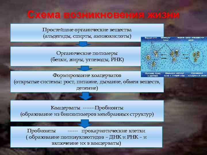 Схема возникновения жизни Простейшие органические вещества (альдегиды, спирты, аминокислоты) Органические полимеры (белки, жиры, углеводы, РНК) Формирование коацерватов (открытые системы: рост, питание, дыхание, обмен веществ, деление) Коацерваты -------Пробионты (образование из биополимеров мембранных структур) Пробионты ------ прокариотические клетки ( образование полинуклеотидов – ДНК и РНК – и включение их в коацерваты)