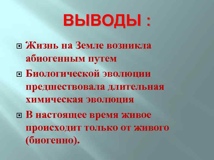 ВЫВОДЫ : Жизнь на Земле возникла абиогенным путем Биологической эволюции предшествовала длительная химическая эволюция В настоящее время живое происходит только от живого (биогенно).