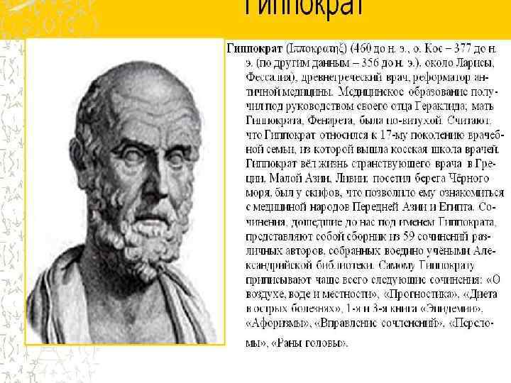 ГИППОКРАТ Самые ранние биографы Гиппократа писали не раннее 200 лет после его смерти и, конечно рассчитывать на достоверность их сообщений – трудно. Гораздо более ценные сведения мы могли бы получить из показаний современников и из самих сочинений Гиппократа.