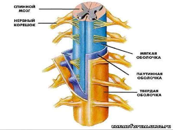 5 4 2 2 1 3 1 7 6 1 -серое вещество(мультиполярные нервные клетки); 2 -белое вещество(миелиновые волокна); 3 -центральный канал; 4 -передняя срединная борозда; 5 -мягкая оболочка; 6 -паутинная оболочка; 7 -твердая оболочка.