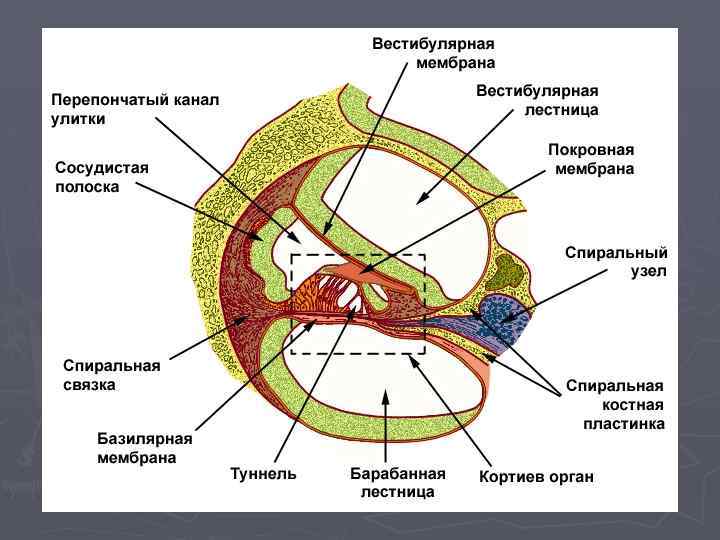 ВЕСТИБУЛЯРНАЯ МЕМБРАНА (1): со стороны вестибулярной лестницы (2) покрыта эндотелием, а со стороны эндолимфы — однослойным плоским эпителием. 3 — вестибулярная губа лимба 4 — сосудистая полоска: многорядный эпителий, в толще которого проходят многочисленные кровеносные сосуды; 5 — спиральная связка: образована плотной волокнистой тканью и является утолщением надкостницы костной улитки. БАЗИЛЯРНАЯ ПЛАСТИНКА (6): со стороны барабанной лестницы (7) покрыта эндотелием (8); основа пластинки — коллагеновые волокна, которые тянутся в косом направлении и, видимо, играют роль струн, откликающихся на колебания определенной частоты), на внутренней поверхности пластинки — кортиев, или спиральный, орган (9), а над ним — 10 — покровная (текториальная) мембрана, которая контактирует с вершинами рецепторных клеток спирального органа. 11 — спиральный костный гребешок (место прикрепления базилярной пластинки).