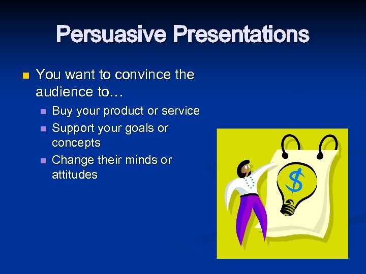 Persuasive Presentations n You want to convince the audience to… n n n Buy your product or service Support your goals or concepts Change their minds or attitudes