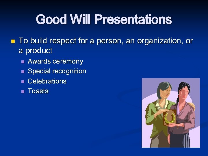 Good Will Presentations n To build respect for a person, an organization, or a product n n Awards ceremony Special recognition Celebrations Toasts