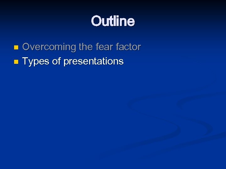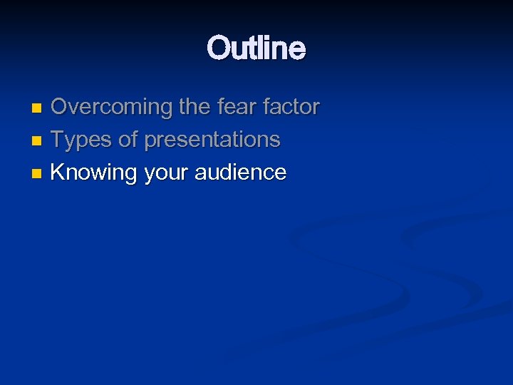Outline Overcoming the fear factor n Types of presentations n Knowing your audience n