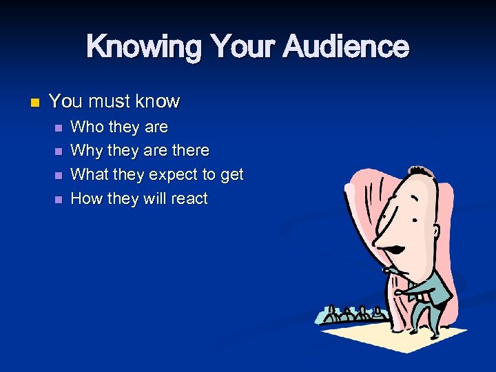 Knowing Your Audience n You must know n n Who they are Why they are there What they expect to get How they will react