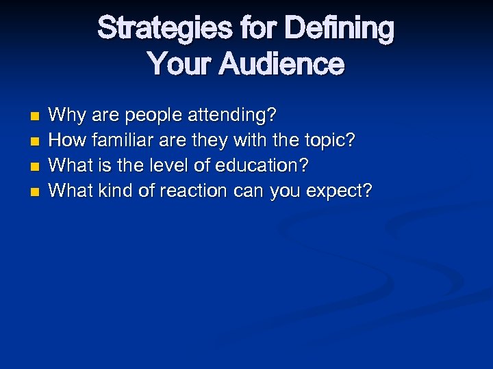 Strategies for Defining Your Audience n n Why are people attending? How familiar are they with the topic? What is the level of education? What kind of reaction can you expect?