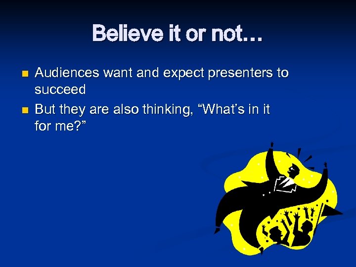 Believe it or not… n n Audiences want and expect presenters to succeed But they are also thinking, “What’s in it for me? ”