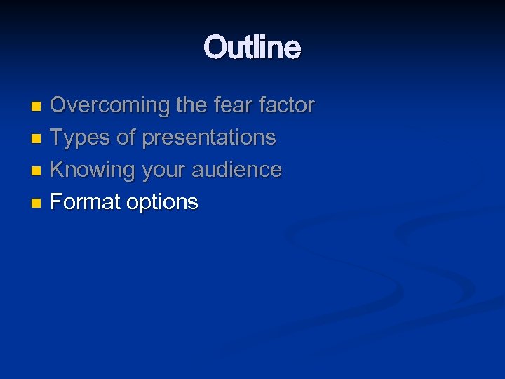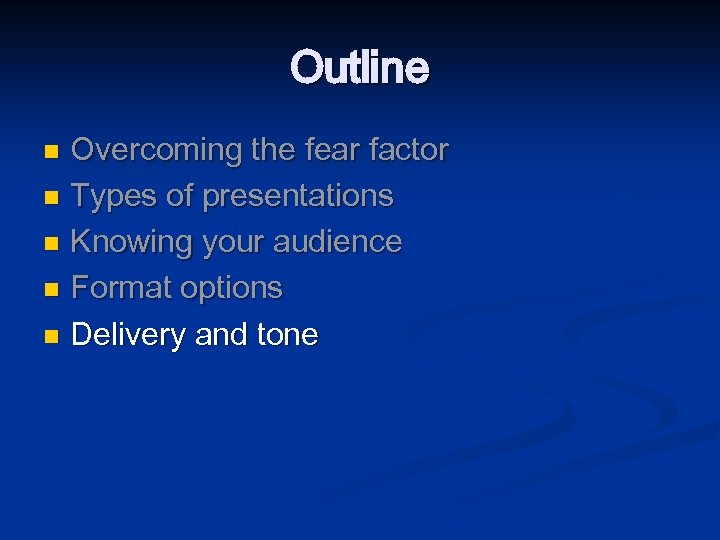 Outline Overcoming the fear factor n Types of presentations n Knowing your audience n Format options n Delivery and tone n