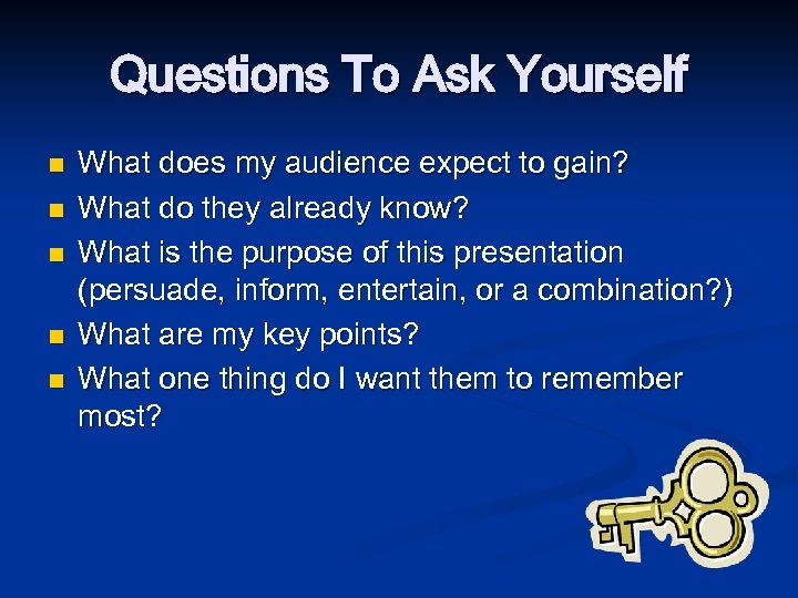 Questions To Ask Yourself n n n What does my audience expect to gain? What do they already know? What is the purpose of this presentation (persuade, inform, entertain, or a combination? ) What are my key points? What one thing do I want them to remember most?
