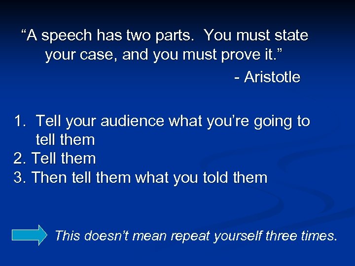 “A speech has two parts. You must state your case, and you must prove it. ” - Aristotle 1. Tell your audience what you’re going to tell them 2. Tell them 3. Then tell them what you told them This doesn’t mean repeat yourself three times.