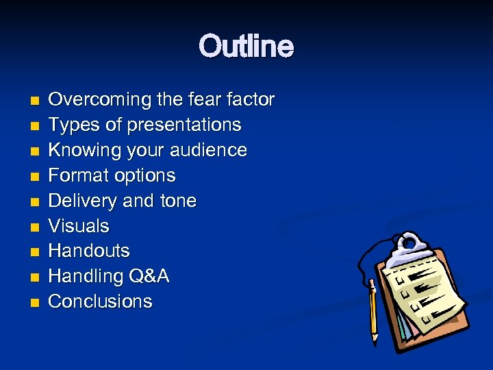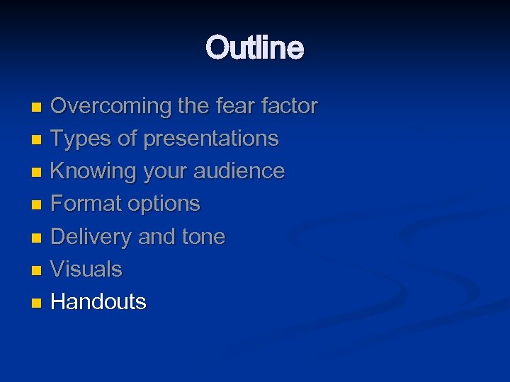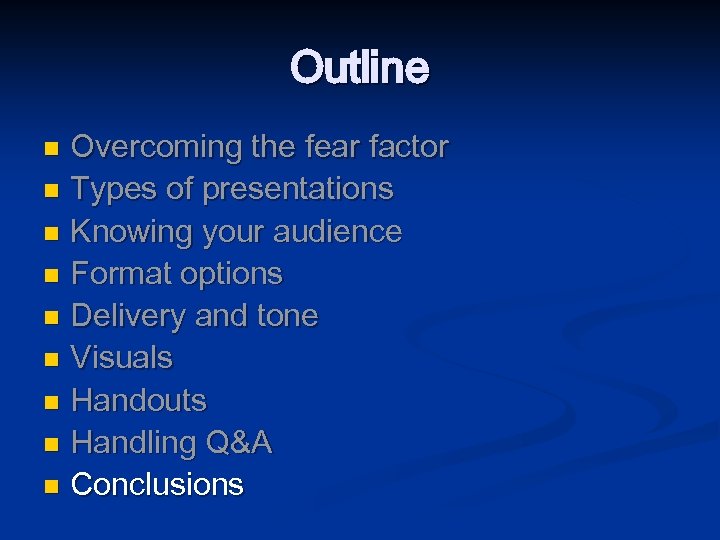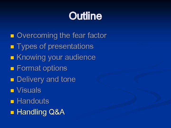 Outline Overcoming the fear factor n Types of presentations n Knowing your audience n Format options n Delivery and tone n Visuals n Handouts n Handling Q&A n Conclusions n