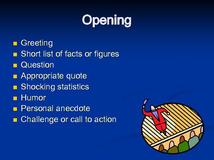 Opening n n n n Greeting Short list of facts or figures Question Appropriate quote Shocking statistics Humor Personal anecdote Challenge or call to action