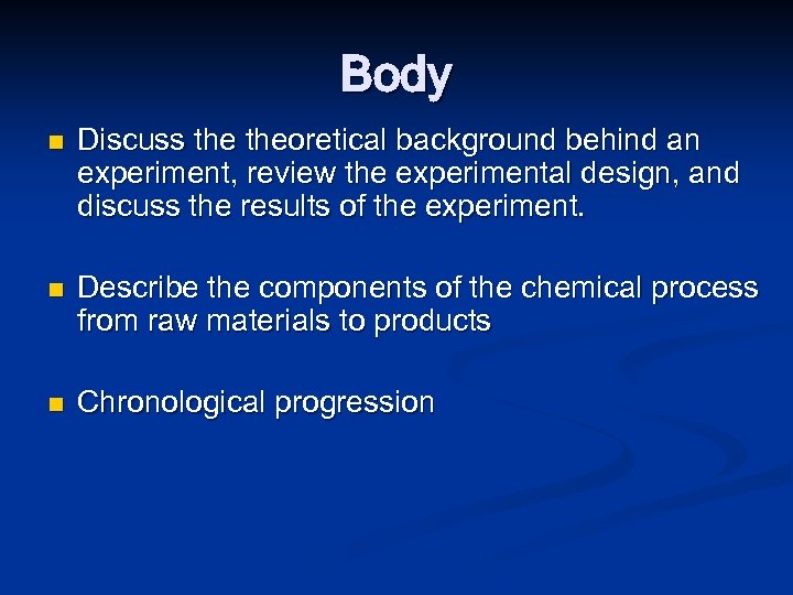 Body n n n Discuss theoretical background behind an experiment, review the experimental design, and discuss the results of the experiment. Describe the components of the chemical process from raw materials to products Chronological progression
