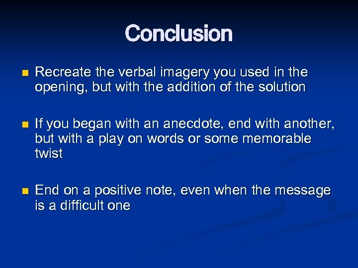 Conclusion n Recreate the verbal imagery you used in the opening, but with the addition of the solution If you began with an anecdote, end with another, but with a play on words or some memorable twist End on a positive note, even when the message is a difficult one