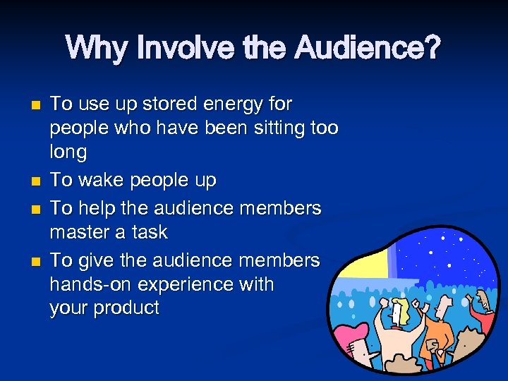 Why Involve the Audience? n n To use up stored energy for people who have been sitting too long To wake people up To help the audience members master a task To give the audience members hands-on experience with your product