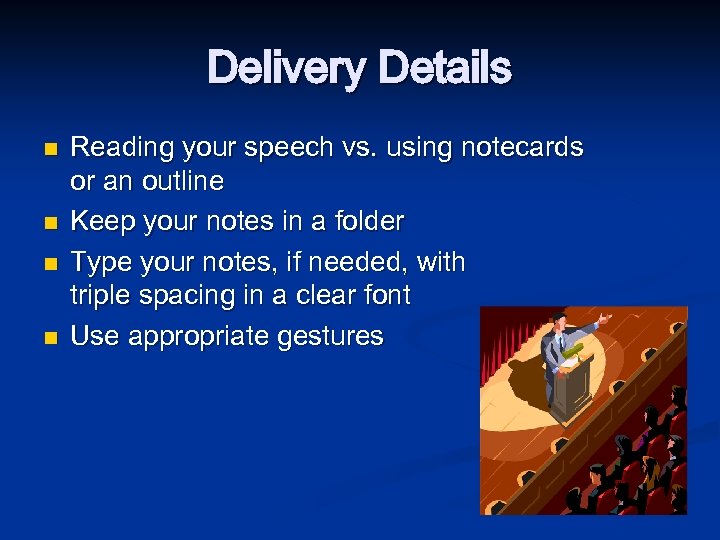 Delivery Details n n Reading your speech vs. using notecards or an outline Keep your notes in a folder Type your notes, if needed, with triple spacing in a clear font Use appropriate gestures