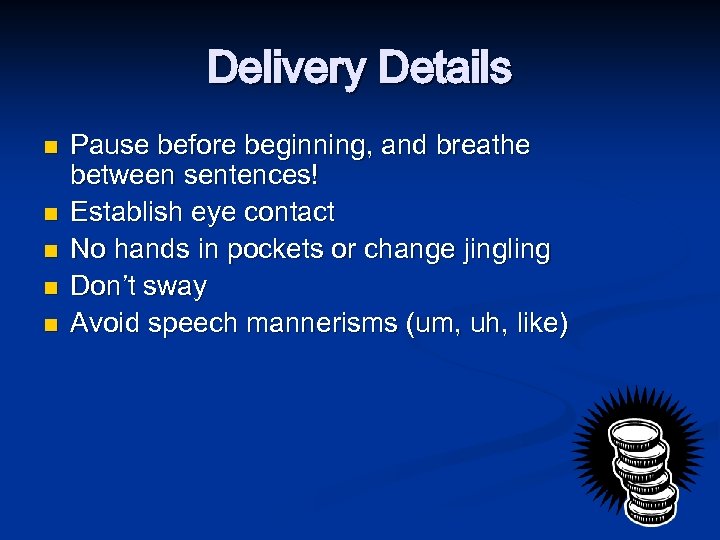 Delivery Details n n n Pause before beginning, and breathe between sentences! Establish eye contact No hands in pockets or change jingling Don’t sway Avoid speech mannerisms (um, uh, like)
