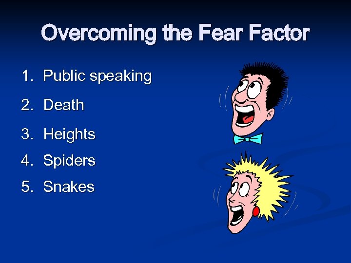 Overcoming the Fear Factor 1. Public speaking 2. Death 3. Heights 4. Spiders 5. Snakes