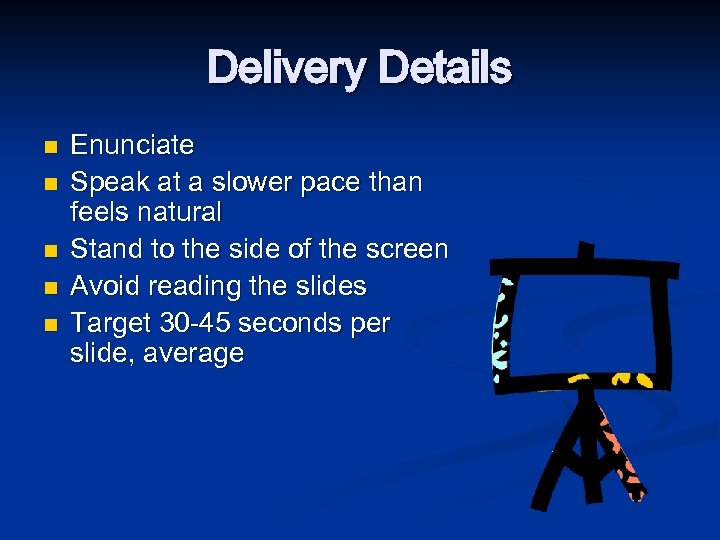 Delivery Details n n n Enunciate Speak at a slower pace than feels natural Stand to the side of the screen Avoid reading the slides Target 30 -45 seconds per slide, average