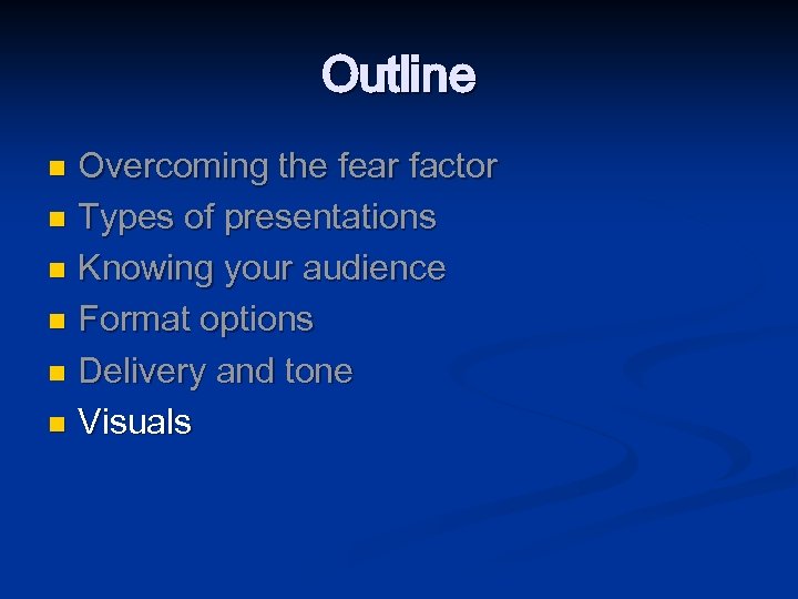 Outline Overcoming the fear factor n Types of presentations n Knowing your audience n Format options n Delivery and tone n Visuals n Handouts n