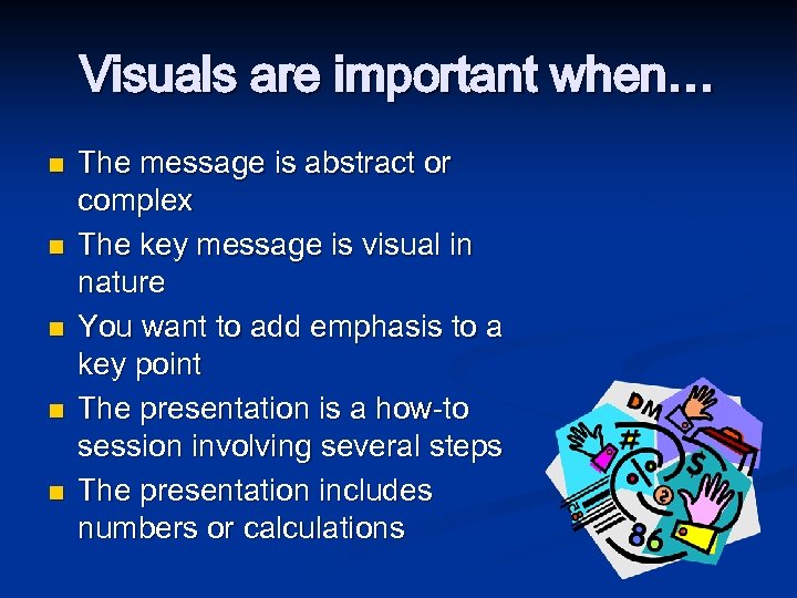 Visuals are important when… n n n The message is abstract or complex The key message is visual in nature You want to add emphasis to a key point The presentation is a how-to session involving several steps The presentation includes numbers or calculations